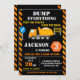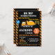 Yellow and orange Construction theme invitation for boy birthday party featuring big dump truck and some construction equipment.