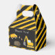 Celebrate your little one's special day with this custom boy birthday party favour box with an adorable construction theme. The box has a dump truck and excavator working together at a road construction site. There are also orange traffic cones, a dirt pile, and yellow and black stripes. Use Thank You text as is or customize.