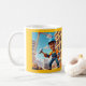 The image shows a smiling cartoon of a construction worker ready to start the job, in a bright blue morning , holding his tools surrounded by heavy construction machinery and tall tows. Behind him is a building under construction. This coffee mug can be customized easily according to your needs.