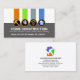 The four construction medals represent some of the service that you might offer e.g. The gold hammer can represent carpentry and renovation, the roller brush for painting, the gold bulb home for electrical works and the blue faucet home for plumbing. Each symbol's representation is for your own interpretation. Just underneath the medals are the business name, a list of possible services and the contact details near the base.
