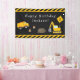 Celebrate your little one's special day with this custom boy birthday party banner with an adorable construction theme. The banner has a dump truck and excavator working together at a road construction site. There are also orange traffic cones, a yield sign, and yellow and black stripes. Add your child's age for a special touch!