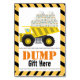 Add fun to your construction-themed birthday party with our "Dump Gift Here" gift station sign featuring a dump truck. Customize with your word if you prefer the words in the sign to mean otherwise. Watch the excitement as guests drop their gifts.
