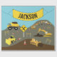 Cute illustration of a construction site and trucks theme. Construction truck transportation vehicles include dump truck, excavator, backhoe, bulldozer, crane and front end loader. The perfect design for truck, heavy machinery enthusiasts boys and girls. Ideal Christmas present, birthday gift, nursery decor, kids room art, home decor or back to school. Customize the name and make it your own.