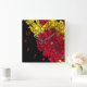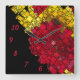 A simple way to add a touch of modern to any home or office wall is with a light weight battery operated wall clock. This contemporary abstract pattern wall clock features a geometrically designed red, black, and yellow rough edged design. The design only includes the five red numbers five through ten over the solid black portion on the lower left.