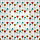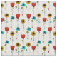 This pretty fabric has an all over pattern of art nouveau inspired floral graphic in red, yellow, turquoise blue, light green and black with simple geometric accents against a white background.
