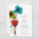 This customizable wedding invitation has a clean and modern look. It features a floral illustration inspired by Art Nouveau design in black, bright turquoise blue, red, light green and golden yellow. Your custom text is in a clean sans serif font.