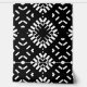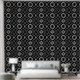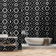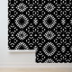 This peel and stick wallpaper features a bold, contemporary design. The pattern consists of interconnected diamond shapes with intricate line details, creating an optical illusion of depth and movement. The colour scheme is monochromatic, with crisp white diamonds against a stark black background. Overall, it’s a striking and engaging piece of decor that would make a statement in any room.