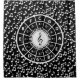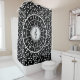 Stylish music themed designer shower curtain in classic black and white featuring a circle of fifths wheel with white random music notes background, great additional to the bathroom for somebody learning the piano or other musical instrument or even just a music lover or music teacher