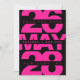 This contemporary save the date card features a hot pink and black colour scheme. Bold sans serif lettering displays the date of the wedding. A smaller font overlay displays the couple's first names, location, and that an invitation will follow. Browse my collection for the matching suite. ••• For more stylish wedding suites, visit my store Zazzle.com/EventsByJessicaAmber ••• For custom orders, message me on Zazzle