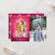 Christmas tree, presents, ornaments, and stars on a magenta background. Add your own photo and customize for personalize holiday greetings.