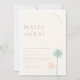 Contemporary Coastal Chic Minimalist Wedding Photo Invitation. Modern beige typography with palm tree accents with single photo backing.