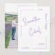 Photo save the date. White background. Modern. Wedding Website on the back as well as photo. Lavender text. Rounded.