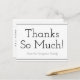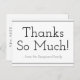 This sleek thank-you postcard design features the message "Thanks So Much!" on the front, along with a personalized message on the back. It could be used to offer thanks to somebody who has attended a wedding, a funeral, or some other event.