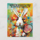 The front of the card features a contemporary, vibrant, and colourful background with abstract shapes in various hues. A lively Easter Bunny holds a tennis racket and looks ready to play. The caption on top reads, "Wishing you an Easter as sweet as a perfectly timed volley!" in a modern font.