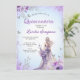 Elegant invitation for a debutante party in shades of purple with touches of glitter silver with an illustration of a dress.