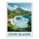 Illustrated poster of the Cook Islands featuring a white sandy beach lined with palm trees, crystal-clear turquoise water, and a lush mountain backdrop. Perfect wall art for a wild and tropical escape.