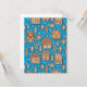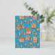 Hand drawn vector pattern featuring various gingerbread houses, fir trees, snowflakes and crescent moon-shaped cookies on blue with falling snow