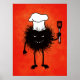 Halloween cooking design with a hairy evil bug - chef. The evil character who wears a chef's hat is holding a spatula with and evil grin showing its sharp teeth. This fun illustration has an intense orange textured background.