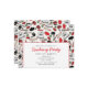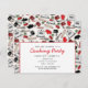A cooking party invitation with a retro inspired red and black pattern of cooking supplies. Pattern features illustrations of a mixer, stove, whisk, spatula, rolling pin, oven mitt, and cherries. Personalize the text on front and back.