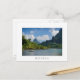 Carte postale de la baie tropicale Cook's avec un bateau et un arrière - plan de volcans avec palmiers et jungle sur l'île de Moorea, près de Tahiti dans l'archipel Pacifique Polynésie française avec une frontière blanche et le texte : 'Mo'orea'.