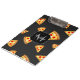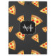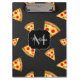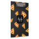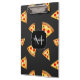 Personalize unique foodie restaurant clipboard with your initial and name. Cool and fun pizza slices colorful pattern on dark gray. Juicy vector made pizza with crunchy crust, cheese, salami, champignon mushrooms, olives and a sprinkle of oregano.
