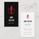 Unique vertical business cards for guitar instructors, music teachers, guitar lessons, musicians or guitar players voice actors or actresses, voiceover artists, vocal talent, and audio recording professionals feature an electric guitar headstock in red on a black background, with two lines of custom text in white lettering. Customize the back with your full contact details, displayed beneath a smaller matching headstock illustration. Whether your specialty is classical, acoustic, electric, or bass, these modern and professional business cards are a perfect way to gain clients and brand your business!