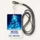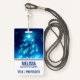 Name badge with a Christmas tree decorated with vibrant electric-blue holiday lights. Sparkling and glittering with festive joy.