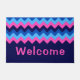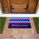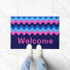 A large monogrammed doormat featuring a bright, colourful pattern design of blue and pink chevrons. Create the perfect customized gift by clicking the “personalized” button to add a name or custom message in the provided template field. Select the “click to customize further” link to change the font, text size and more.