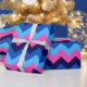 A roll of wrapping paper featuring a pretty, colourful pattern design of blue and pink chevrons.