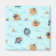 Cute ice blue color theme of a pool party with funky illustration design of pool toys and people having fun in a large aquamarine pool. Perfect for a Summer vacation holiday vibe.
