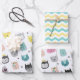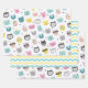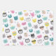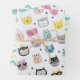 Here's a cute set of gift wrap paper sheets for anyone who loves cats! Two of the sheets have a pattern of cute cool cartoon cat faces in multiple colours, but predominantly teal, yellow, and pink. The images are placed on a white background. The third sheet has a coordinating chevron stripe pattern in the same teal, yellow, and white. A cute gift wrap package that is appropriate for many gift giving occasions, including birthdays and baby showers.