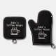 Cool coffee shop logo custom business name Oven Mitt & Pot Holder Set. Personalize with your own name or quote. Black and white or custom colour. Cute pixel design of cup with hot steam. Great for home, professional shop, store, business, office, bistro, restaurant, kitchen etc. Barista gift ideas.