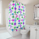 This shower curtain has a mid-century modern design of a grid made of horizontal and vertical black lines with rectangles in various vibrant shades of green, blue, and purple.