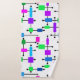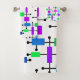 This towel set has a mid-century modern design of a grid made of horizontal and vertical black lines with rectangles in various vibrant shades of green, blue, and purple.