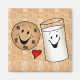 Fun festive cartoon of tall glass of white milk with a happy smile face, and a tasty chocolate chip cookie. They are both grinning, with a red heart in between. Dark and light brown colour scheme with fun patterns and colours. This design is available in many different product selections.