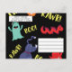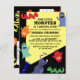 This cool and cute hand-drawn monster illustration sleepover Birthday Party invitation is a fun and unique design for your little boy. The design features colourful red, orange, blue, and green adorable monsters on top of a yellow lighted background coming from a flashlight. On the back is monster sounds typography and monster pattern on a simple pitch black background. This unique and cute design will set the mood for your creepy and exciting slumber party event.