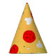 Pizza party Party Supplies Paper Party Hats to celebrate kids birthday. Juicy vector made pizza with crunchy crust, cheese, salami, champignon mushrooms, olives and a sprinkle of oregano.