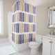 Celebrate your geeky love of double rainbows or LGBTQ pride with a cool custom shower curtain featuring a series of geometric barcodes each comprised of two rainbows made of pairs of coloured stripes that correspond to UPC numbers. The numbers correspond to the letters in "rainbow" to make a double rainbow. Since barcodes are only 12 numbers long, the "r" is represented by the red start and middle stripes. The sequence starts on the left with red, orange, yellow, green, blue, indigo, and violet. Two stripes of red serve as a divider in the middle and then the colours go from violet back to red for a balanced look.