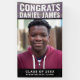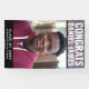 This graduation banner sign features a photo of the graduate in the middle. Above it reads in simple white typography "Congrats" with a name on a purple brick background Below is the Class and school name for you to personalize in white on black. Congrats on your graduation! Designed by artist Susan Coffey.