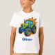 This personalized boys' t-shirt features a powerful green farm tractor with blue accents and large, rugged tires, set against an energetic, stylized background.