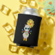 A can cooler with a cool looking llama wearing some dark sunglasses. Dressed in a colourful striped scarf and fun little boots. A bright yellow sun with a happy kawaii face in the background. Whimsical colourful triangles surround this fun loving llama. Black background.