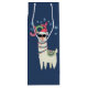 Wine gift bag with a funny illustration. A cute llama wearing black sunglasses and a red santa hat. Also wearing a South American styled blanket and pom-poms. The word Joy written above his head in a festive colourful font. Blue snowflakes falling down.