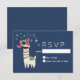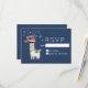 A Christmas RSVP card with a funny illustration. A cute llama wearing black sunglasses and a red santa hat. Also wearing a South American styled blanket and pom-poms. The word Joy written above his head in a festive colourful font. Blue snowflakes falling down. Set on a blue background. Whimsical and fun Christmas themed design.