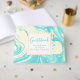 A stylish and sophisticated wedding guestbook with an elegant faux marble pattern with swirling colours in turquoise blue and cream colours. A cream coloured frame with a gold border layered over top with your personalized wedding details inside.