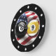 This cool man cave wall clock is designed with a billiards 8 ball and 9 ball billiards balls along with a patriotic American flag graphic you can put on the wall of your pool room, man cave, or even a billiard hall wall.