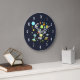 A clock with a cute and colourful pattern with all kinds of outer space themed elements. Images include astronauts floating around in their white space suits. Stars and planets and cool little rocket ships, spaceships, and satellites. Fun and crazy design.