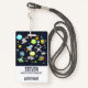 Fun joke name tag with a cute and colourful pattern with all kinds of outer space themed elements. Images include astronauts floating around in their white space suits. Stars and planets and cool little rocket ships, spaceships, and satellites. Fun and crazy design.