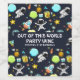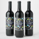 Wine labels with a cute and colourful pattern with all kinds of outer space themed elements. Images include astronauts floating around in their white space suits. Stars and planets and cool little rocket ships, spaceships, and satellites. Fun and crazy design.