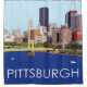 This unique design features a computer illustration of the Pittsburgh skyline overlooking the Roberto Clemente Bridge and boats on the Allegheny River. The text "PITTSBURGH" is superimposed over the river in a simple white font. Makes a great gift for anyone who loves the Steel City.
