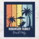 Personalized navy blue beach party wine labels for your family trip to Hawaii, Florida, or other tropical island destinations. Cool palm trees sway against retro colours of orange and yellow above your customized vacation name in white script. Great for a group going on a cruise or coastal getaway.